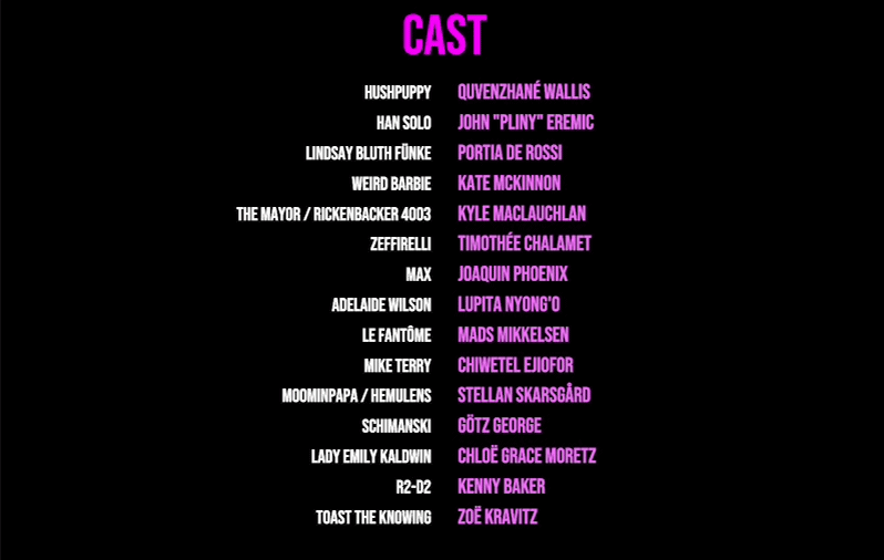 It contains pairs of Roles ("Princess Leia", "Best Boy Electric") and Names ("Carrie Fisher", "Alan Smithee").